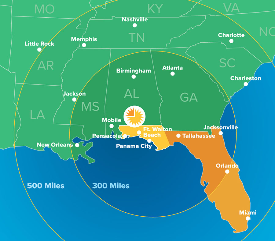 The Florida Panhandle offers a centrally located solution to serve markets in the Southeast United States within the Federal Motor Carrier Safety Administration’s 14-hour “driving window” for a drive-time of up to 11 total hours.